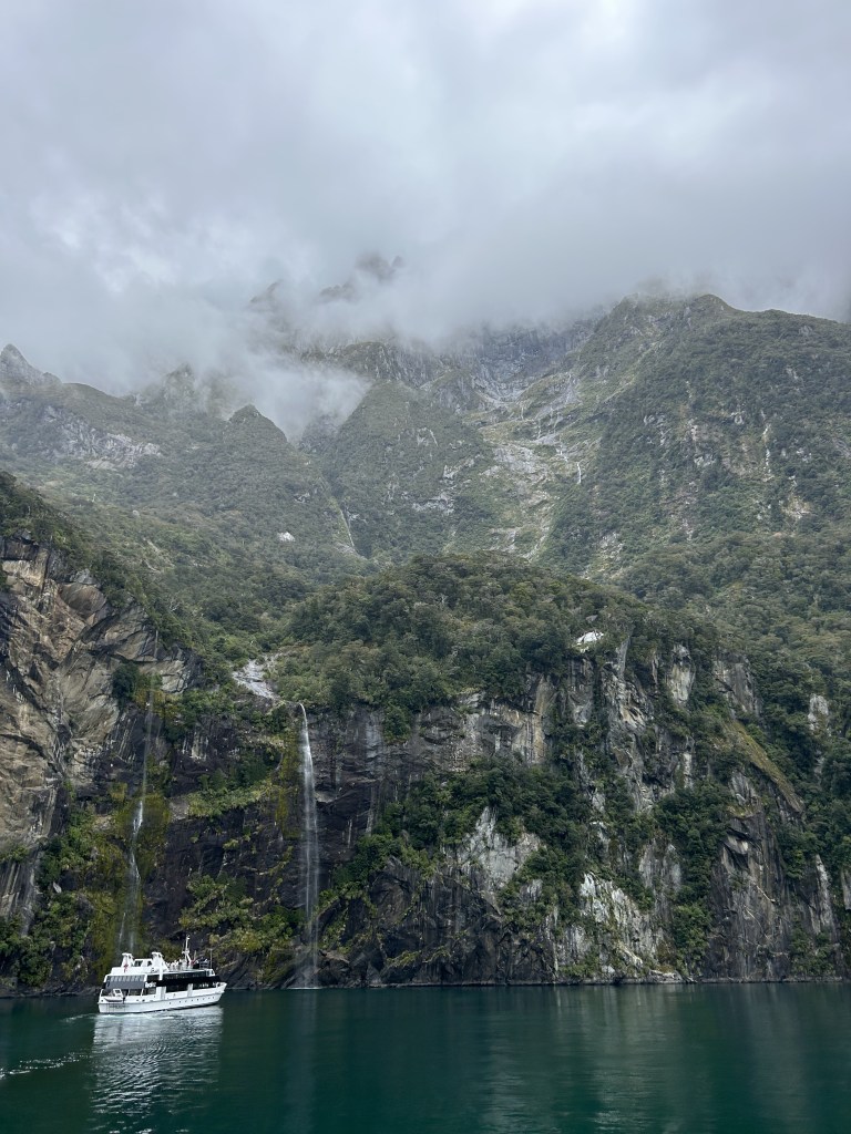 Soon enough, we were surrounded by moss-covered mountains submerging from dark turquoise waters. Layers of clouds sat on the many peaks as we gracefully glided through the water. We passed a few fountains and went onto the viewing deck to get some photos. The Milford Sound fjords were just as beautiful as the ones we saw in Norway last year.