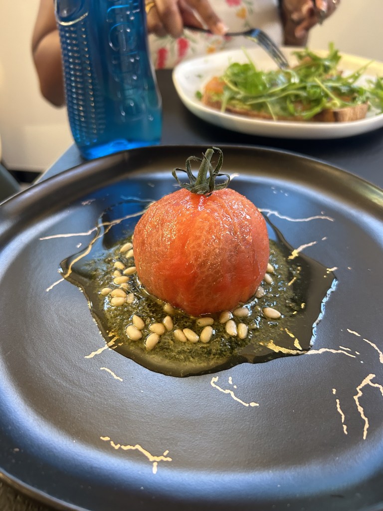 Another thing we spotted on the menu was this burrata “trapped in a tomato” which was unusual but amazing to try.
